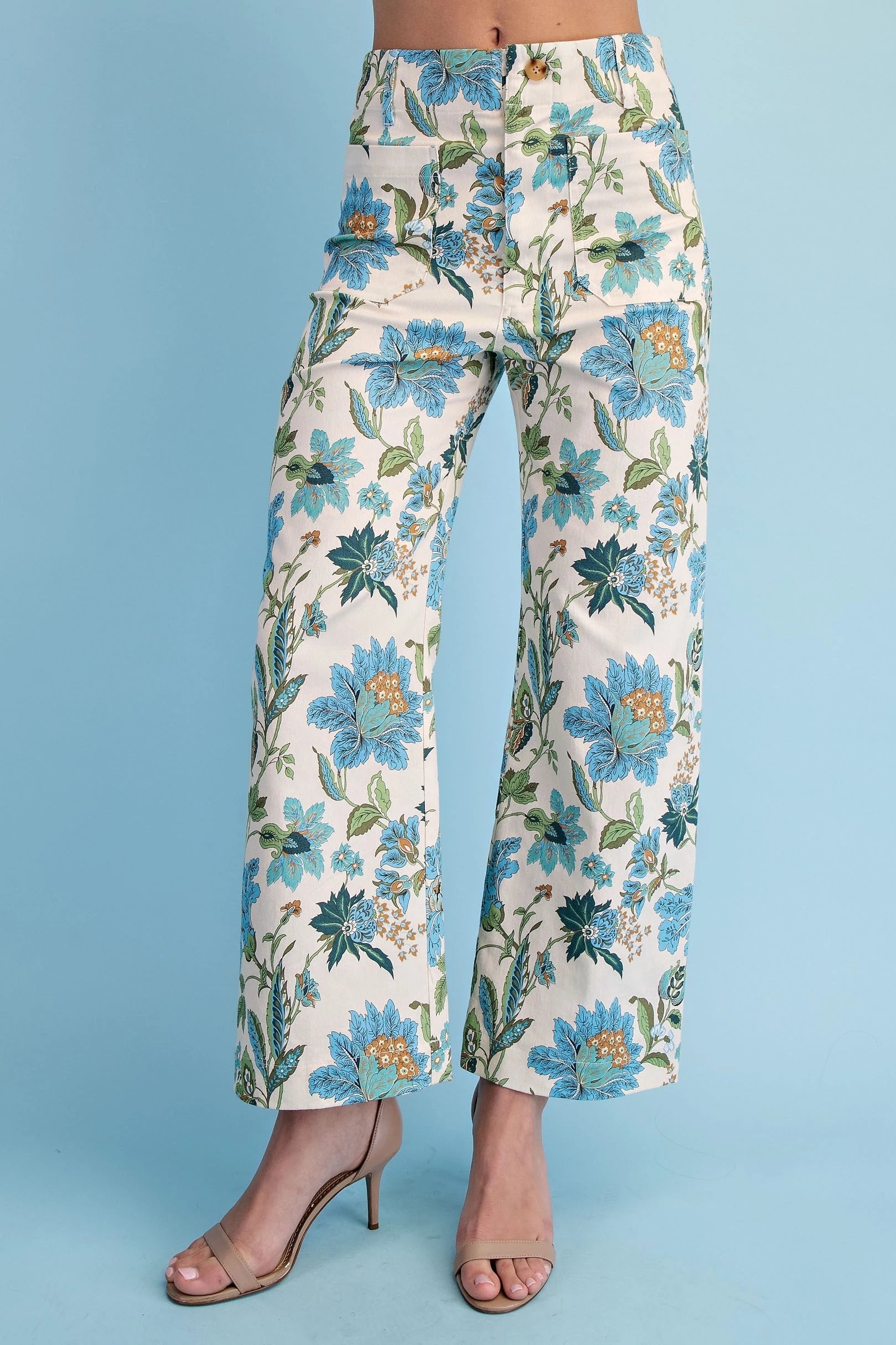 Floral Ankle Cropped Pants in a Stretchy Denim-Like Fabric with Pockets