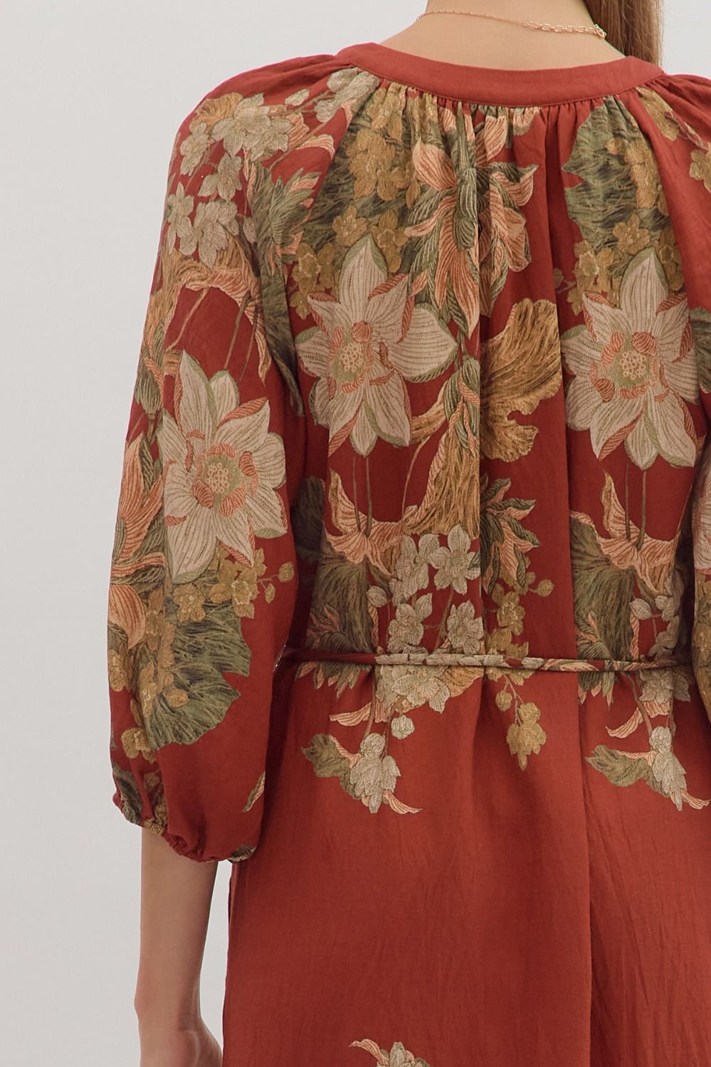 Floral print long sleeve midi dress featuring button closure at front and adjustable drawstring waist. Elasticated sleeve openings. Side pockets. Lined. Woven. Non-sheer. Lightweight.