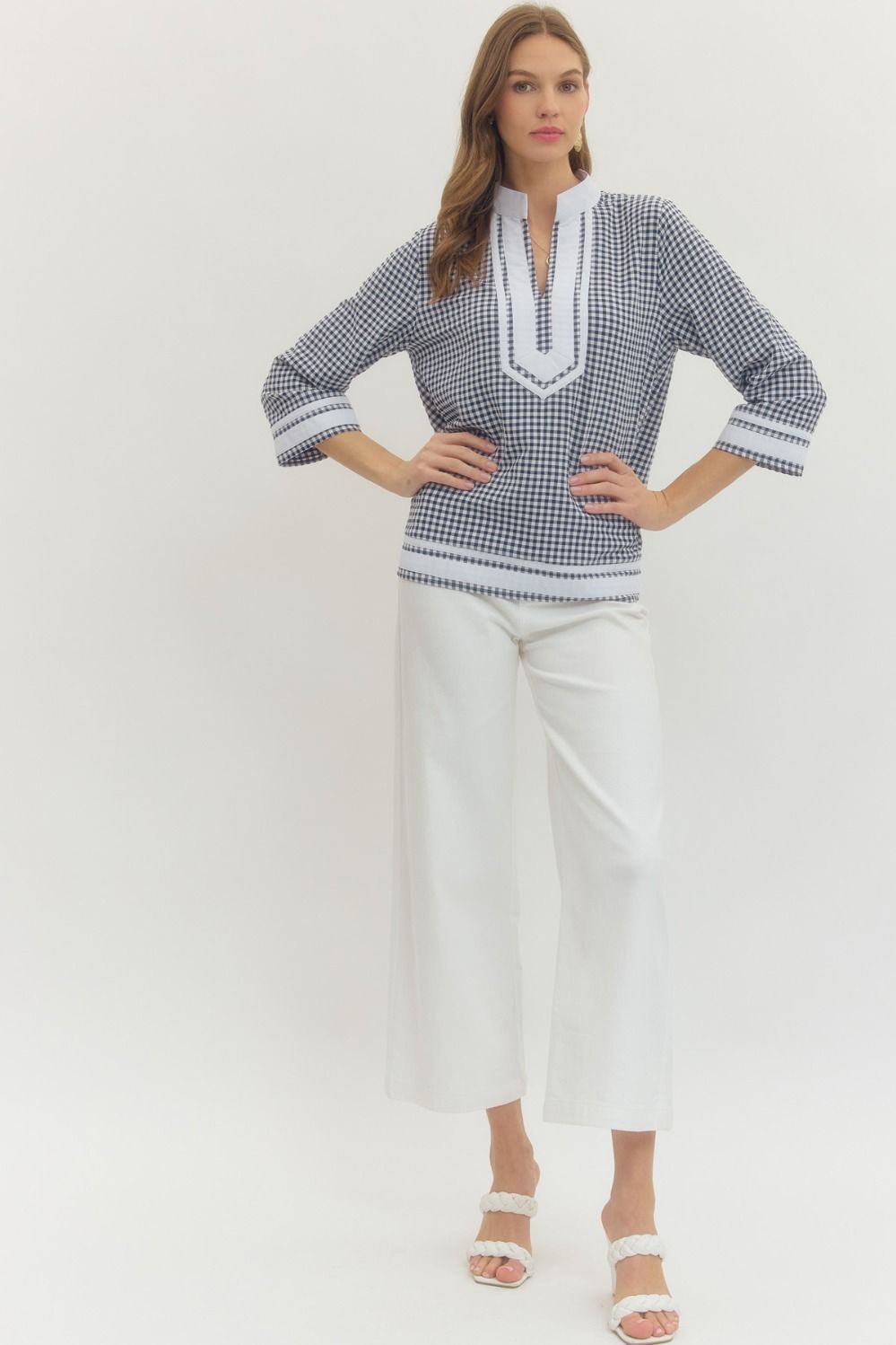 Gingham 3/4 sleeve top featuring contrast trim V-neck band collar. Side slits. Unlined. Woven. Non-sheer. Lightweight.
