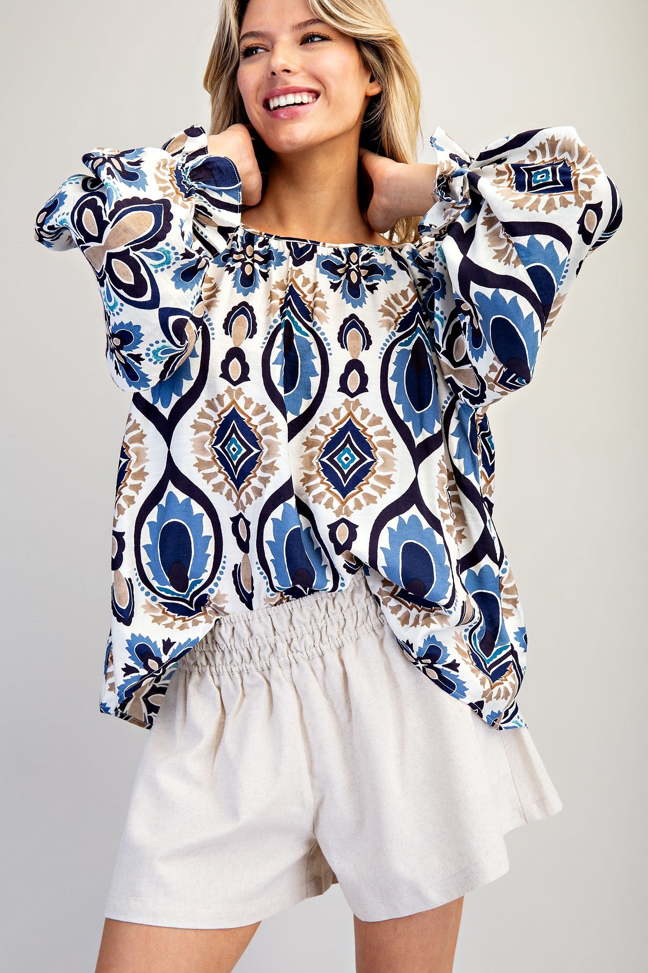 This bold printed top features a breezy, oversized silhouette with a rounded neckline, voluminous long sleeves finished with elastic cuffs, and an easy straight hem that highlights its vibrant, statement making print.