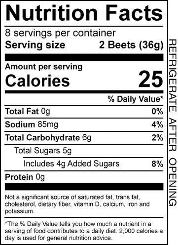 Ingredients: beets, water, sugar, vinegar, salt, natural flavors.