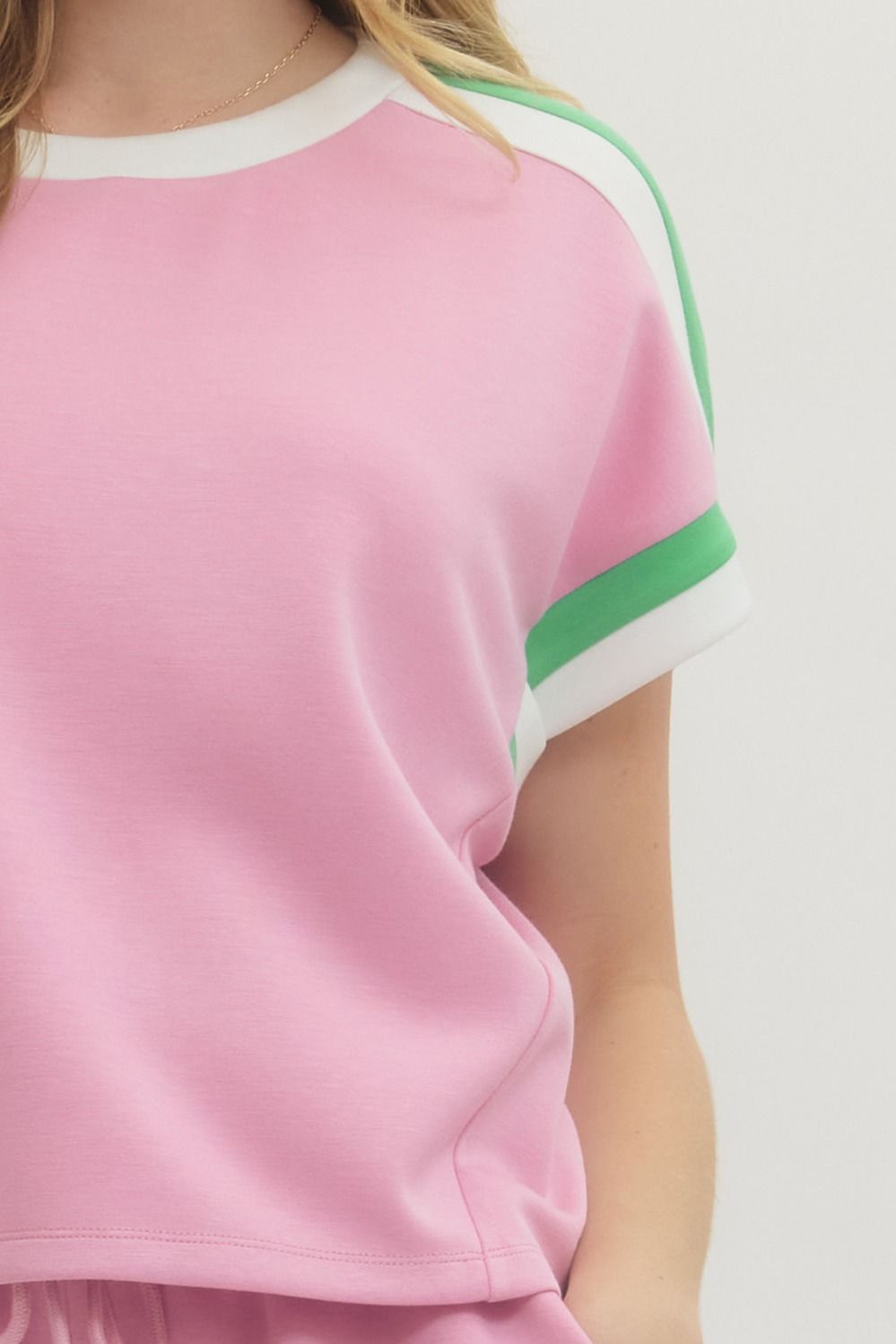 Solid short sleeve knit top featuring contrast trim at neckline, sleeves, and shoulders. Unlined. Knit. Non-sheer. Lightweight.