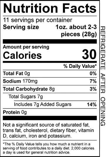 Ingredients: cucumbers, cauliflower, banana peppers, pepperoncini, onions, red bell pepper, water, sugar, vinegar, salt, garlic, natural flavors, alum, tumeric, 1/10 of 1% sodium benzoate (preservative), sodium metabisulfate for color retention, and polysorbate 80.