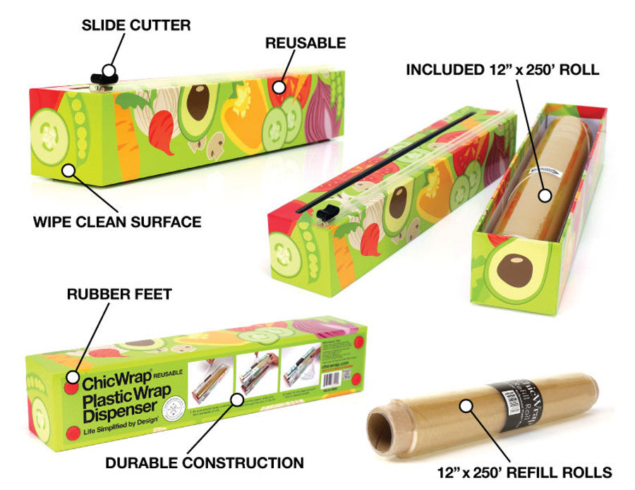 DETAILS: Each dispenser comes with one 12 " x 250 Ft. roll of BPA free professional grade plastic wrap, four rubber feet for stability on any counter and our patented ZipSafe® Slide Cutter. Our professional grade plastic wrap is FDA approved, Kosher certified, Halal certified and microwave safe.